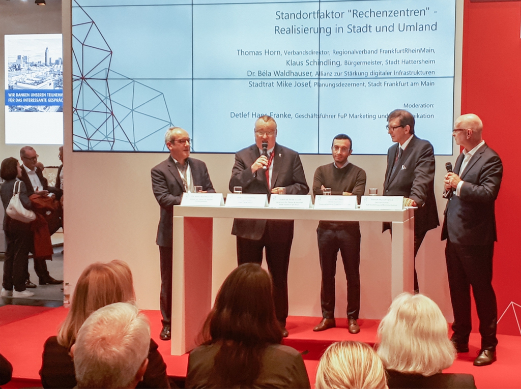 Am Dienstagnachmittag fand in der vollbesetzten Metropolarena der Metropolregion FrankfurtRheinMain dann die Podiumsdiskussion mit dem Titel „Standortfaktor Rechenzentren – Realisierung in Stadt und Umland“ statt. FrankfurtRheinMain ist ein Magnet für Rechenzentren. Doch die Neuansiedlung im Ballungsraum ist eine Herausforderung. Wie Rechenzentren verträglich angesiedelt werden können und weshalb sie als wichtiger Standortfaktor gefördert werden sollten, diskutierten Verbandsdirektor Thomas Horn (Regionalverband Frankfurt-RheinMain), Stadtrat Mike Josef (Stadt Frankfurt am Main), Dr. Béla Waldhauser (Sprecher der Allianz zur Stärkung Digitaler Infrastrukturen in Deutschland, CEO Telehouse Deutschland GmbH) und Bürgermeister Klaus Schindling (Stadt Hattersheim am Main).