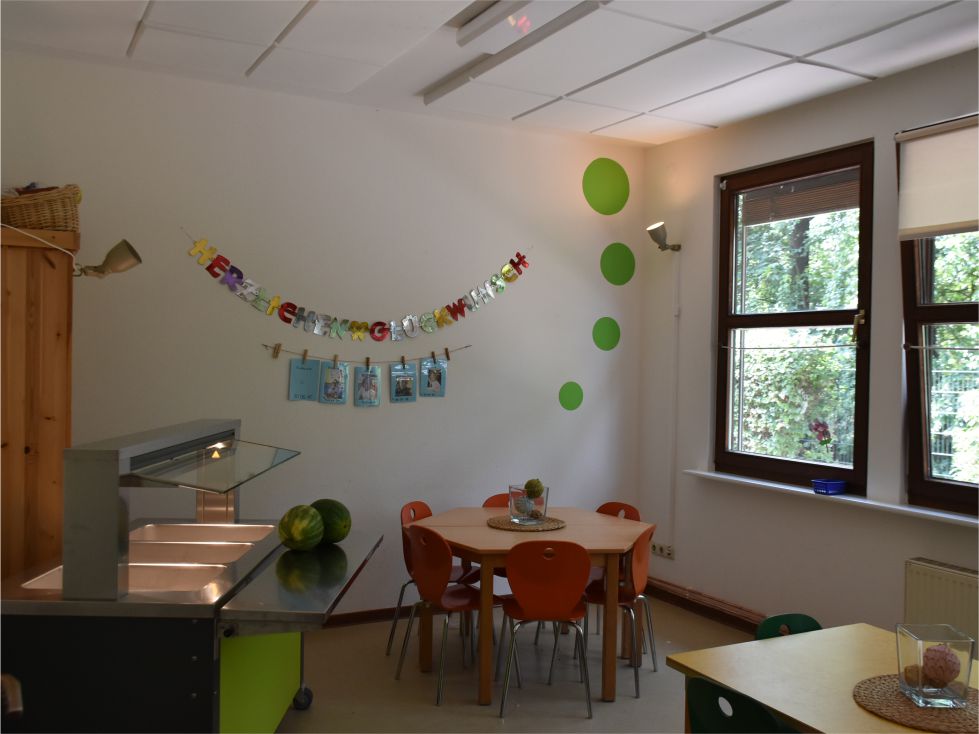Ab einem Betreuungsplatz von 12.30 Uhr erhalten bis zu 25 Kinder ein leckeres Mittagessen. Die Mahlzeit wird in einer anderen ortsnahen städtischen Einrichtung von zwei Hauswirtschaftskräften täglich frisch zubereitet und zu uns in die Einrichtung geliefert.